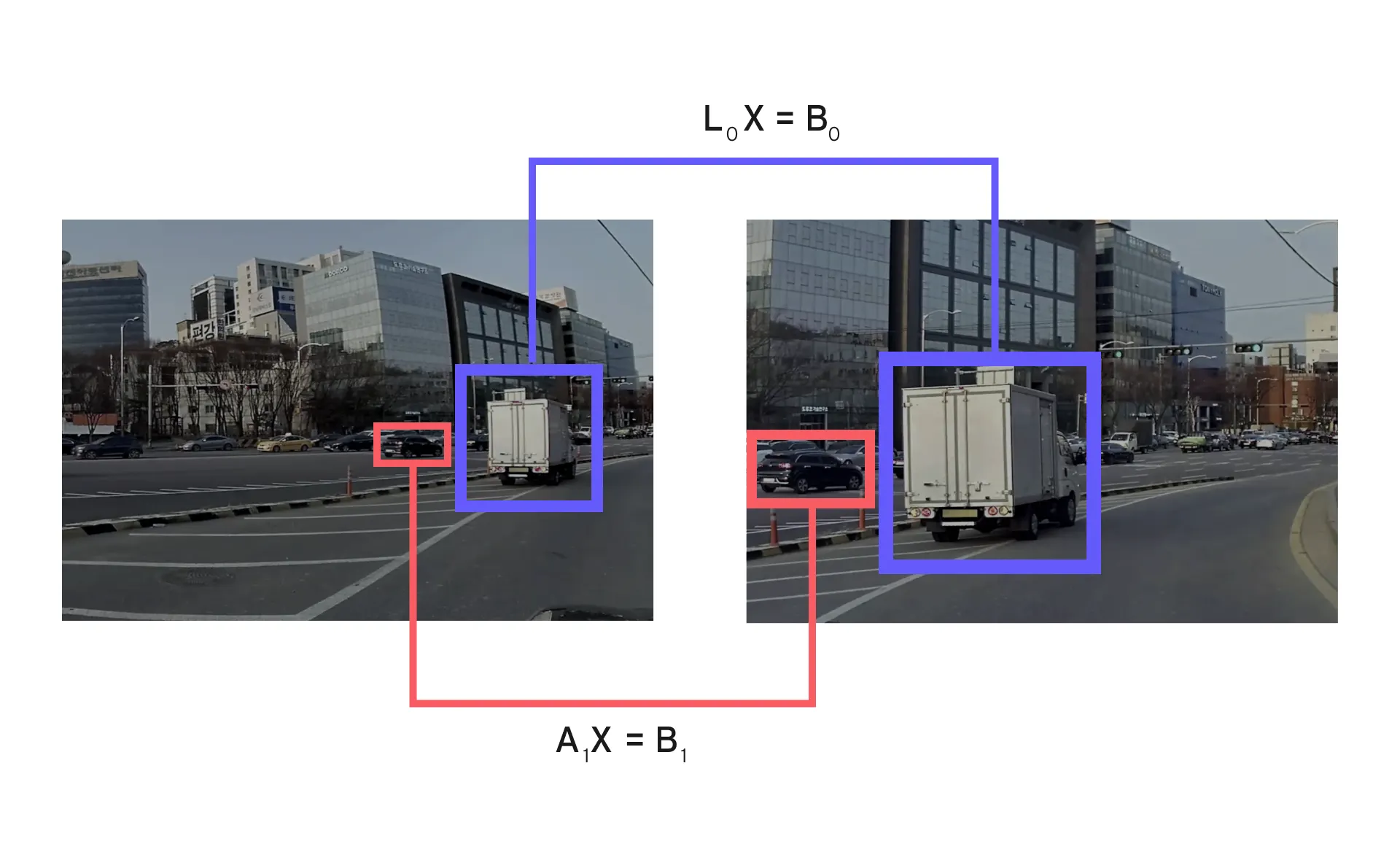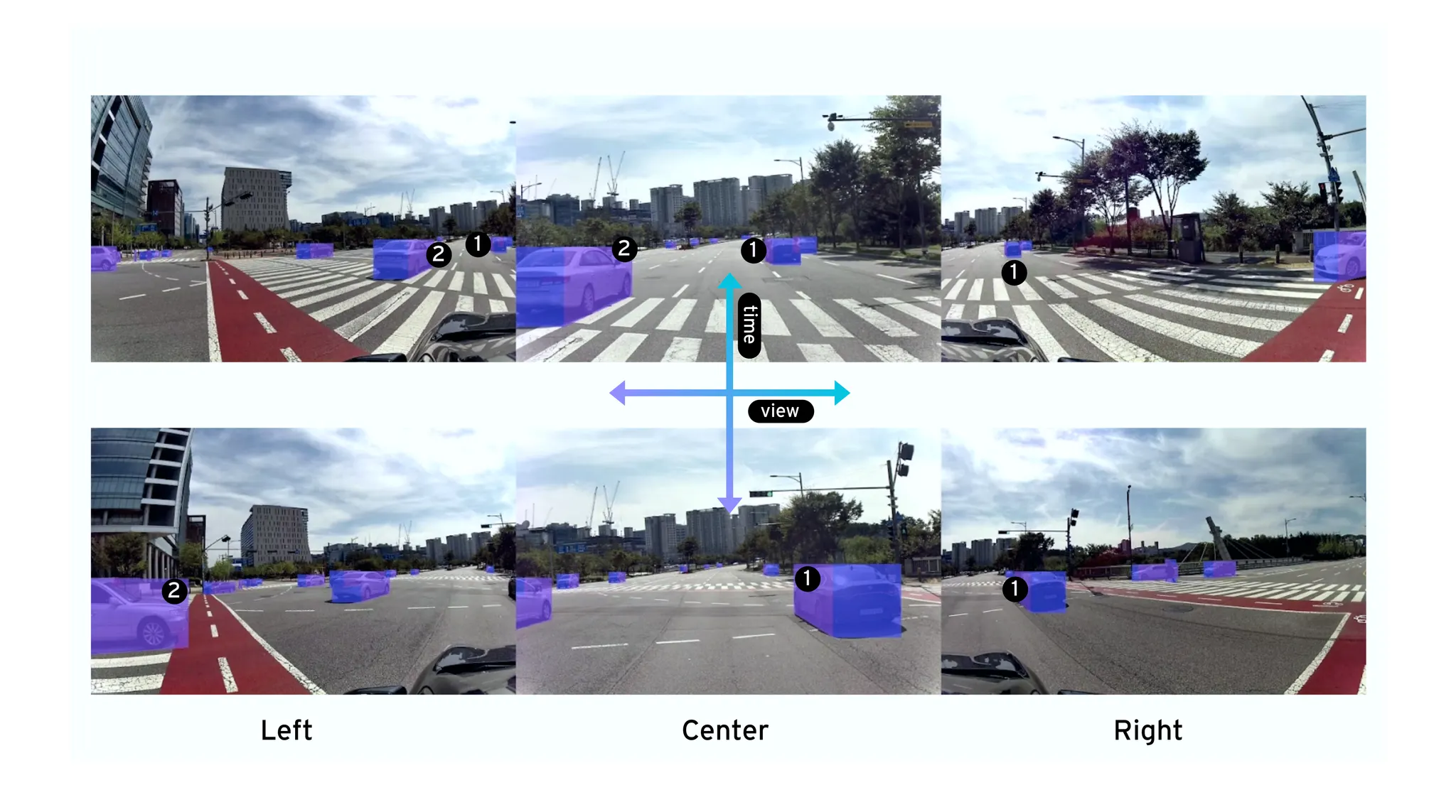 위와 같이 다른 방향(left, center, right)을 바라보는 서로 다른 카메라에서 동시에 인지된 객체에 대해서는 고유한 트랙 ID가 할당됩니다. 해당 ID는 시간이 지나도 계속 유지되어야 합니다.
