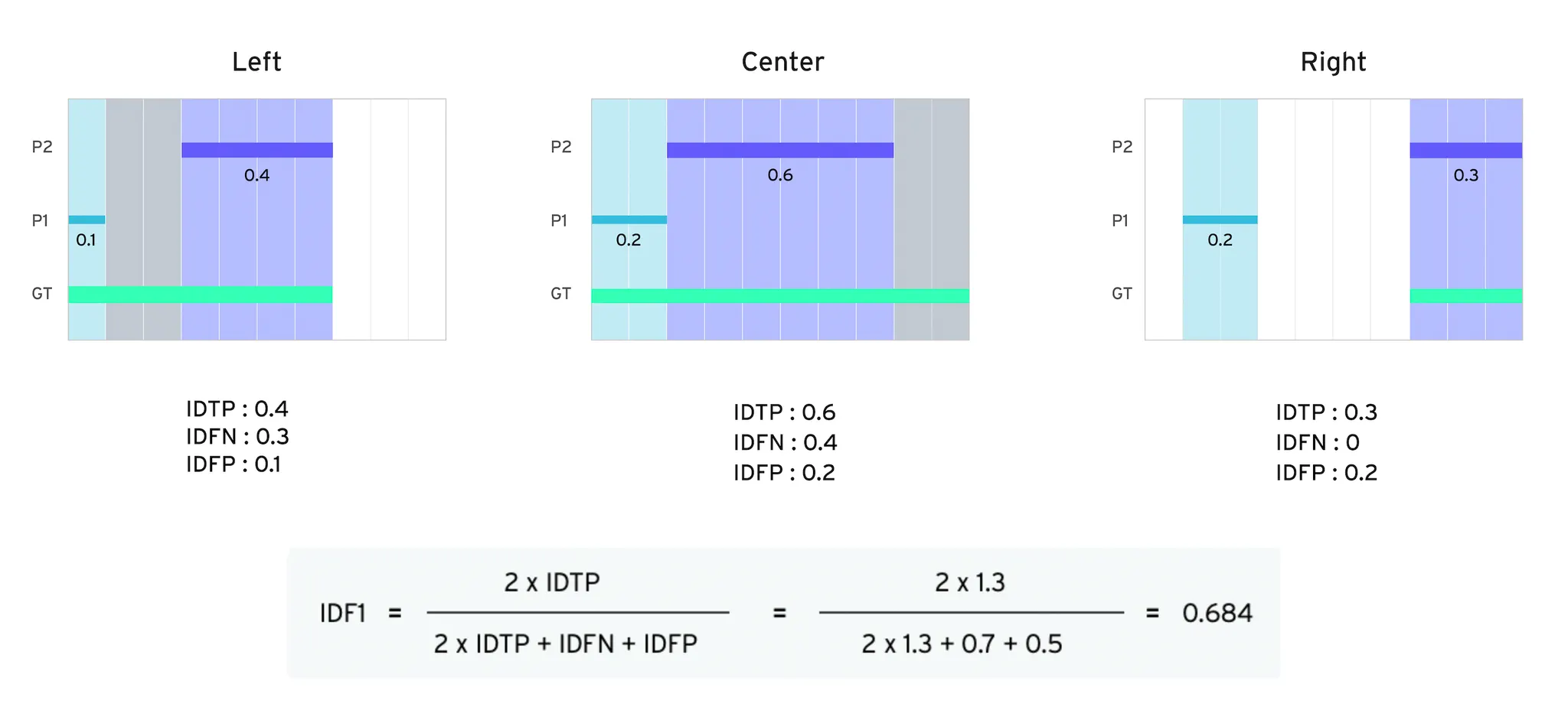 순위를 다투는 챌린지에서는 올바른 지표 설정이 중요합니다. MCMOT 챌린지에서는 IDF1[1] 스코어를 이용하여 카메라 시점과 무관하게 트랙 ID가 얼마나 지속되었는가에 대하여 평가합니다. 아래의 그림은 IDF1의 계산 방법을 설명합니다. 예제는 객체가 왼쪽에서 오른쪽으로 이동하는 상황을 가정합니다. 좌측 카메라 시점(left)에서 보이던 객체는 시간이 지남에 따라 사라지고 우측 카메라 시점(Right)에 다시 나타납니다. GT(ground truth)와 동일하게 하나의 트랙 ID를 사용한다면 IDF1 점수는 1.0으로 최대가 됩니다. 예제와 같이 P1과 P2로 트랙 ID가 둘로 나뉘는 경우, IDF1 점수는 1.0보다 작은 값이 되었음을 확인할 수 있습니다.