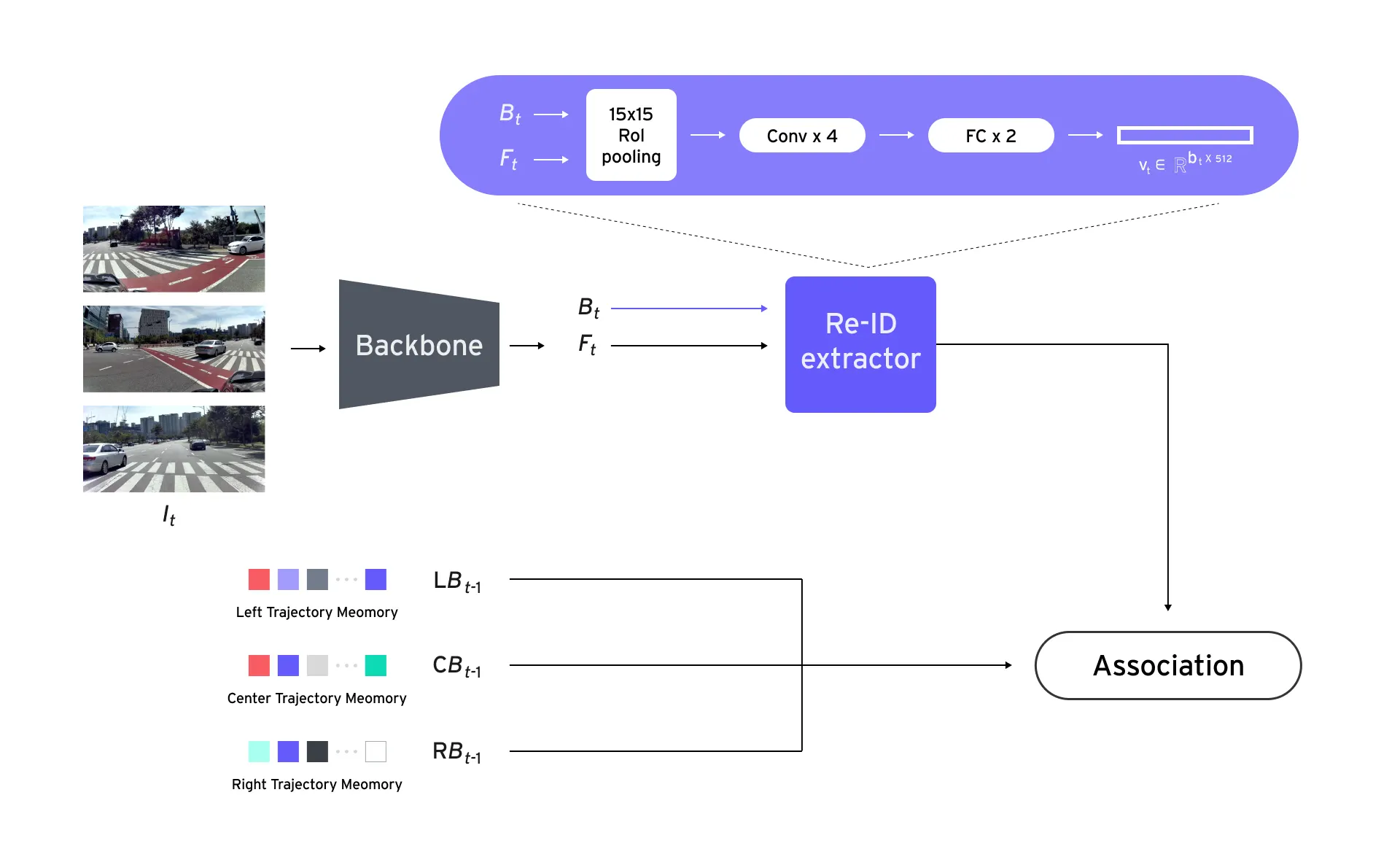 MCMOT를 위한 Re-ID 모델의 구조는 아래와 같습니다. 동일 시간대의 모든 카메라 입력 영상을 backbone 모델에 통과시켜 특징 벡터 F_t를 추출합니다. F_t는 챌린지에서 주어진 객체 정보 B_t 와 함께 Re-ID 추출 모델의 입력으로 사용합니다. Re-ID 추출 모델은 아래 그림과 같이 간단하게 pooling, conv, 그리고 FC 레이어로 구성되며, 객체는 512 차원의 벡터로 변환됩니다. 여기서 얻어진 Re-ID 특징 벡터를 이용하여 객체 사이의 매칭이 이루어지고 기존 trajectory에 동일한 객체가 존재하는지 association이 진행됩니다.