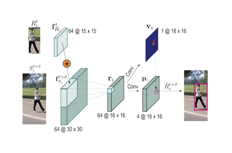 또한 siamese tracker [6] 기반의 모션 모델도 추가했습니다. Siamese tracker는 이전 프레임의 객체 box를 padding 해서 2배로 확장 후 현재 프레임으로 적용을 합니다. 확장하지 않은 이전 프레임의 객체는 15x15 pooling을 진행하고, 2배를 확장시킨 현재 frame의 객체에 대해서는 30x30 pooling을 수행합니다. 이후 convolution layer를 통과시켜 현재 frame의 객체의 center point와 box regression 값을 구하게 됩니다.