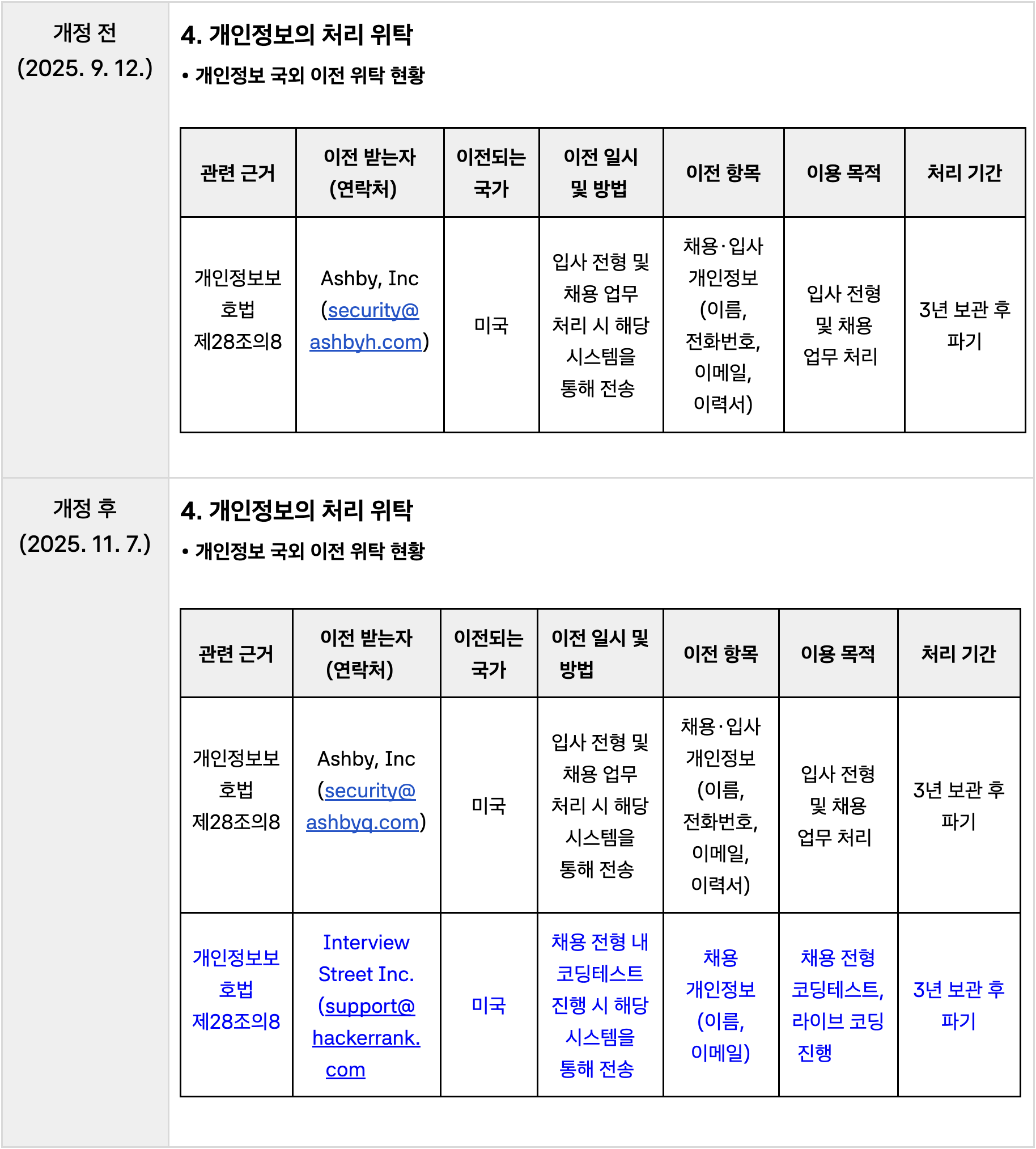 ◦ 채용 전형 내 코딩테스트 및 라이브 코딩의 진행을 위해 개인정보 국외 이전 위탁사에 InterviewStreet Inc. 추가